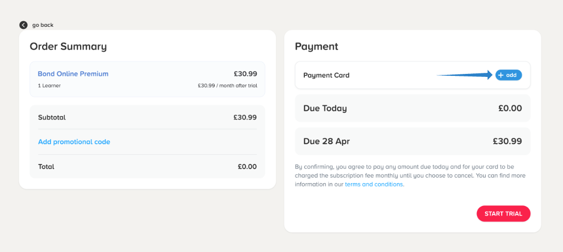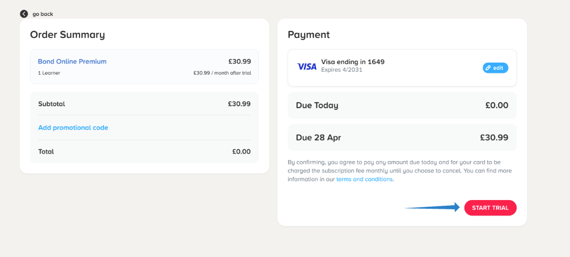 You will then see the order summary again with your card details added. Once finished then, click "Start Trial"