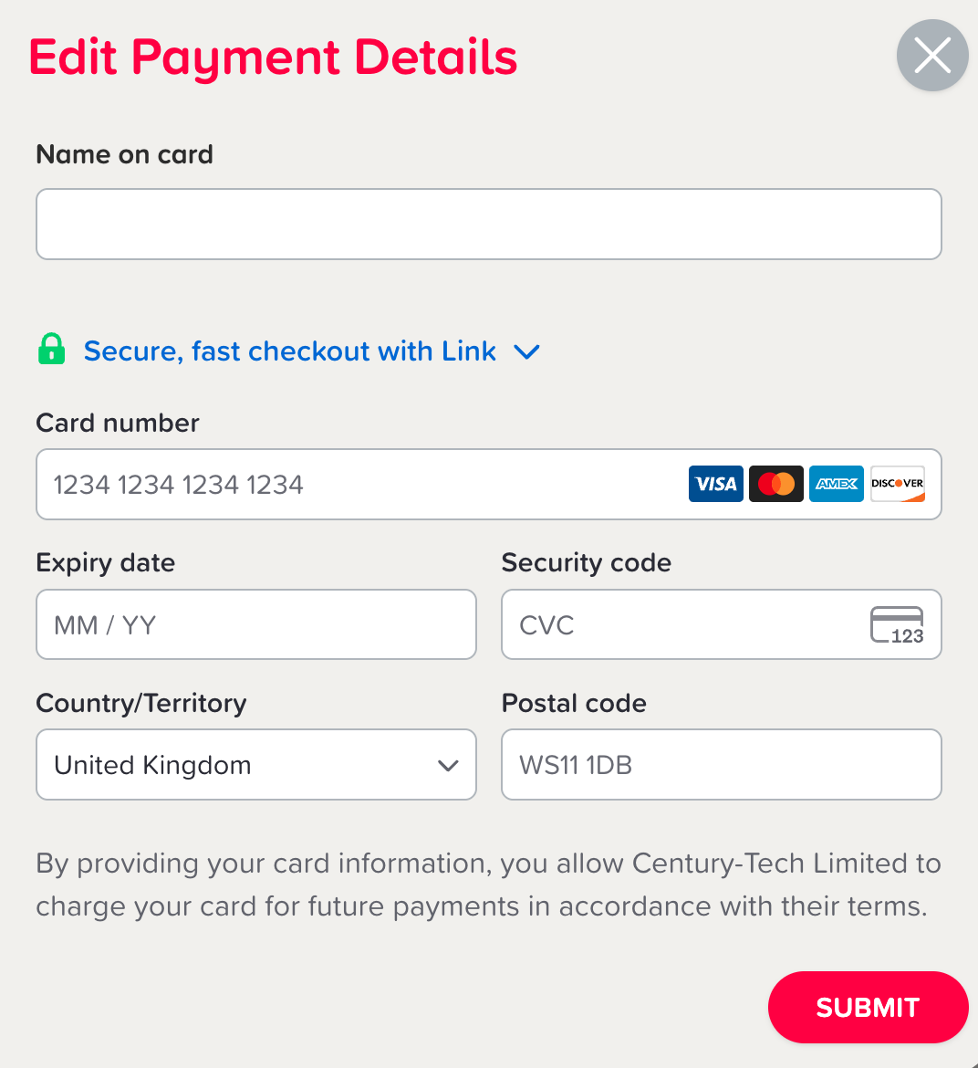 To add your payment details, click "+ add" this will open a screen for you to add the following details as seen below;